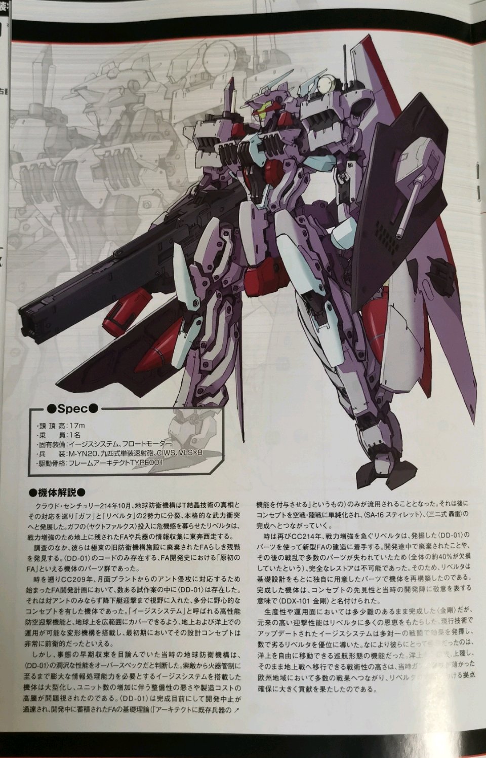 时间追溯到了cc209年,为了对抗月面工厂的ANT的进攻而开展了FA开发计划,DD-01就是数个试做案之一,这个机体是具有对进入视野中的降下艇进行迎击作战的概念设计的,搭载了被称为圣盾系统的高性能防空系统(宙斯盾???),并且能适应多数的地形,搭载了变形机构能适应地上和海上的作战,在当时是十分前卫的设计概念。