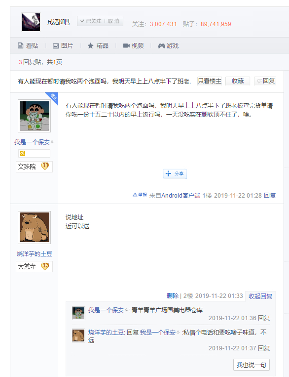 本来半夜没事又睡不着,刷贴吧看到有个老哥饿了,于是我就说大家出门不容易能帮就帮一手,反正两盒泡面也不贵。