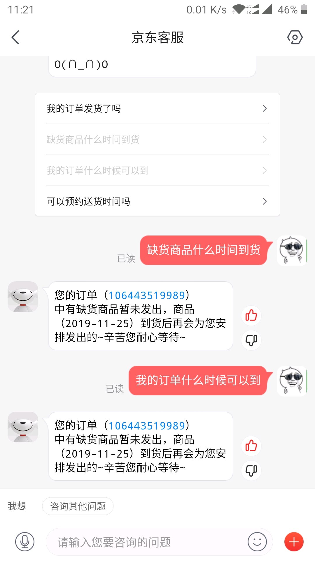 我电话客服3个时间12.30 11.22 11.27 网页客服是11.27按顺序发货