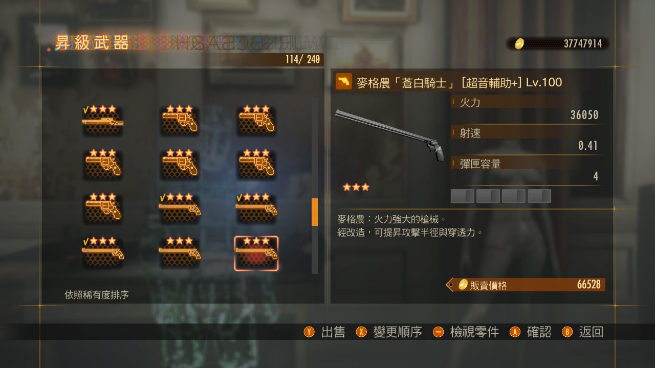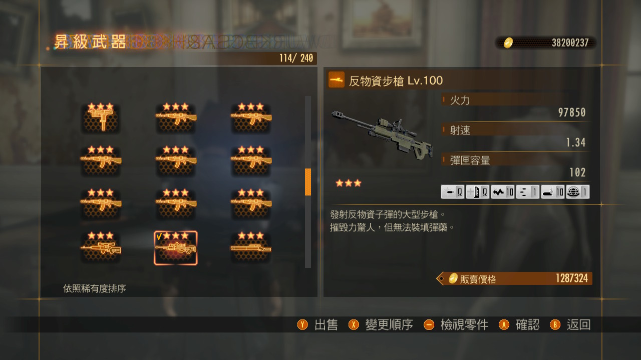 最后秀一下已经刷出来的称号百级武器,除了一个霰弹枪(4孔塞尔伯洛斯)之外,都是六孔的,还是比较令人舒适的。不过悲伤的是,有用的武器一个都没有
