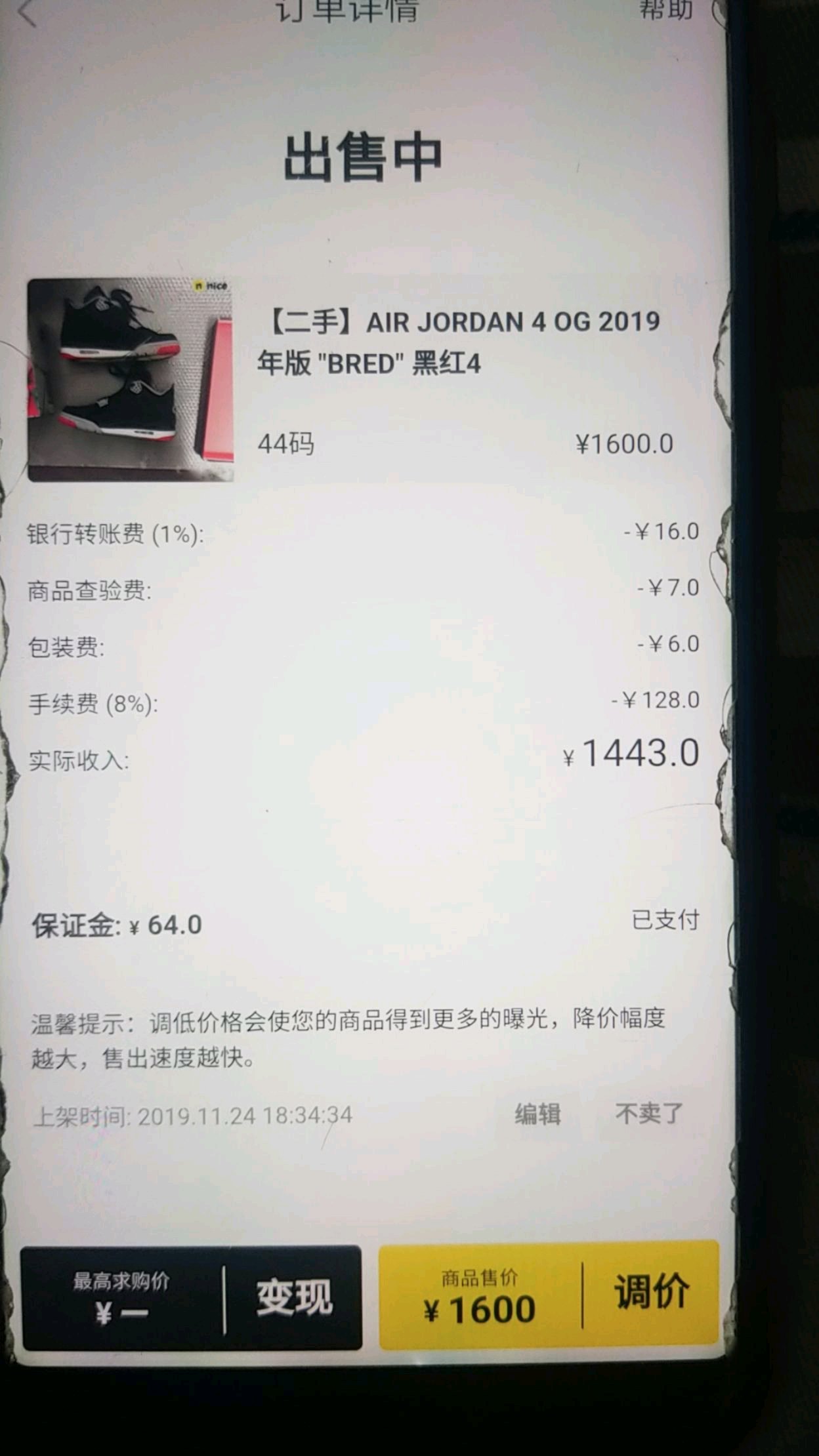 这个aj4黑红44码我刚发的,可以私我讲价,手续费真几儿高