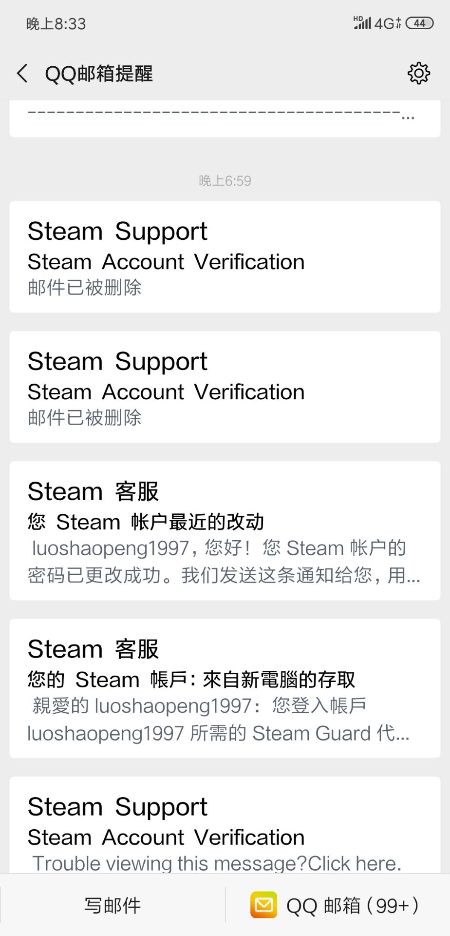 估计是下载一些CAD图纸时候中的毒, 今天晚上6点左右打了把DOTA,7点的时候邮箱被刷爆,然后号就被改密和改邮箱了