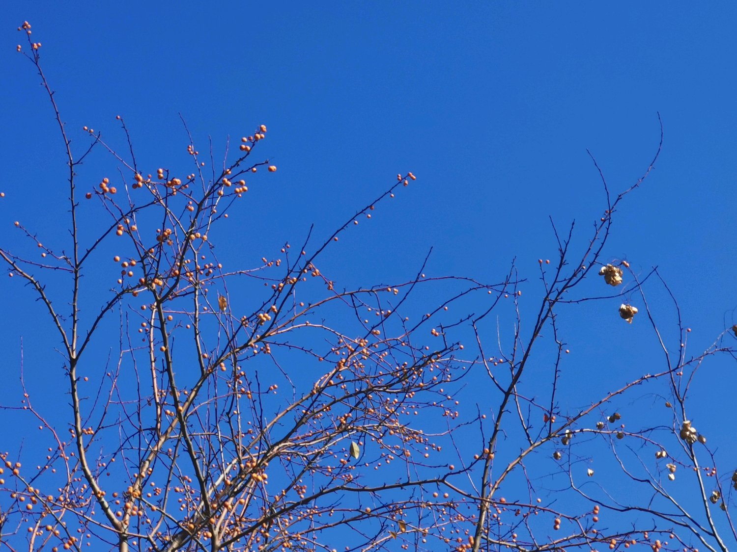 纯黄色的花边裙都被昨晚上的风给抢走了,零星小果还在倔强,等着吧,这零下的天气赌你忍不过一周。哼!