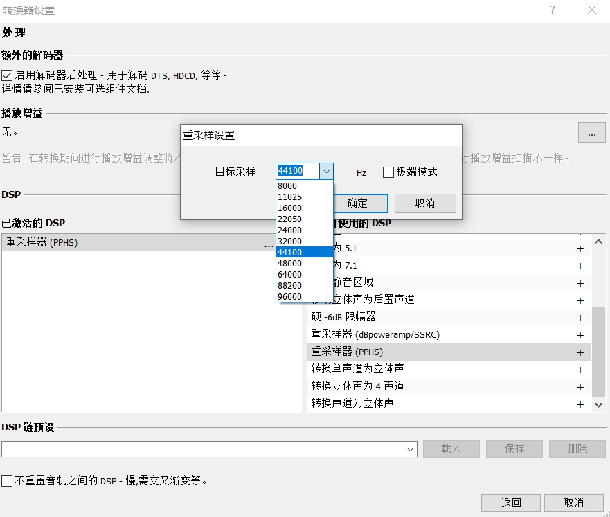 采样率在转换器设置→处理(额外的编码器)→可使用的DSP→重采样器