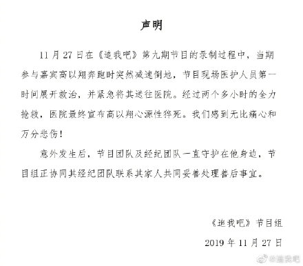 11月27日,高以翔公司、《追我吧》节目组发声明证实高以翔去世,表示艺人在录制综艺时昏厥,送往医院经过三小时抢救后无效去世,年仅35岁。