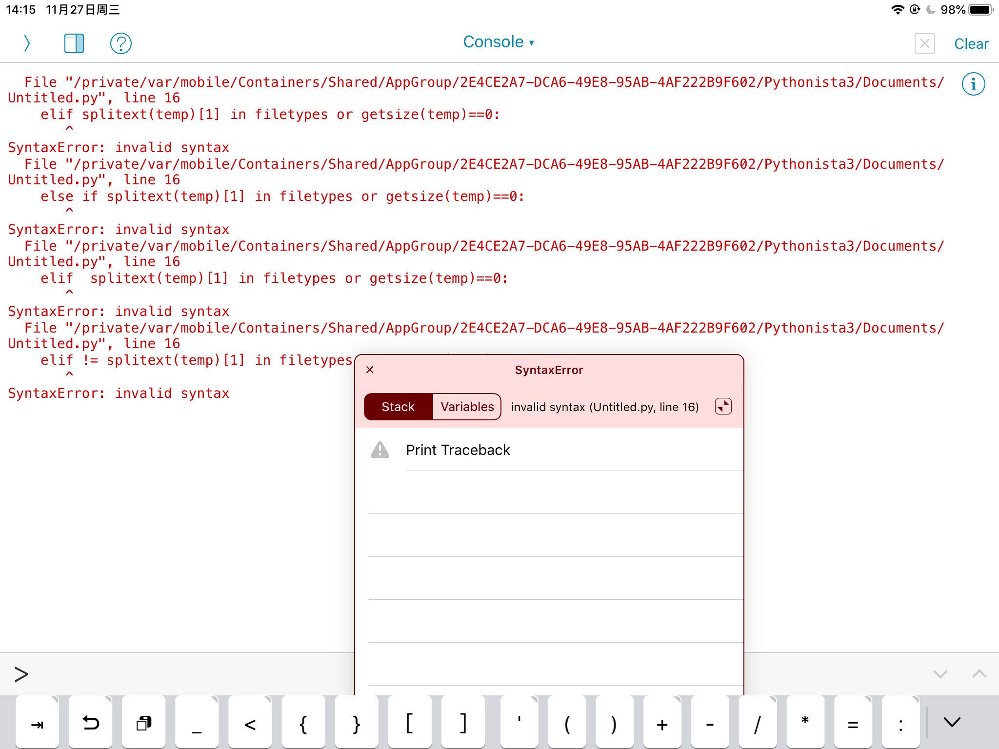错误信息出现:invalid syntax ,基本都是语法错误,检查语法、缩进、错误的使用了中文标点等情况。