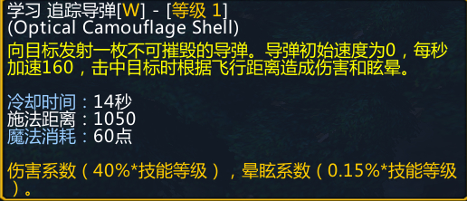 该技能是一个小的控制技能,眩晕时间和伤害都与技能等级挂钩,切与导弹飞行距离有关。