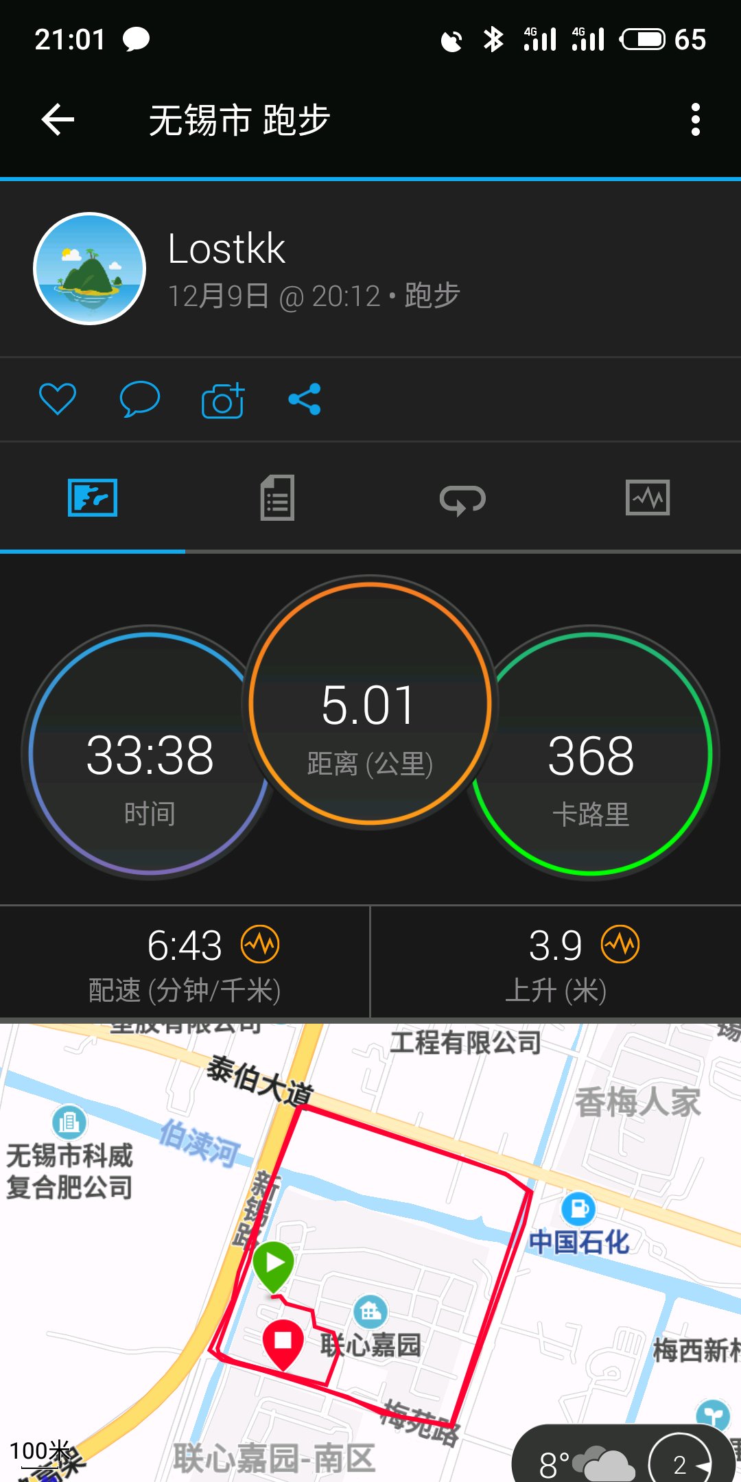 今天压着心率跑,本来想跑个8km试试,跑到4km对右溪有点不舒服,就只跑了5km,配速没什么提高