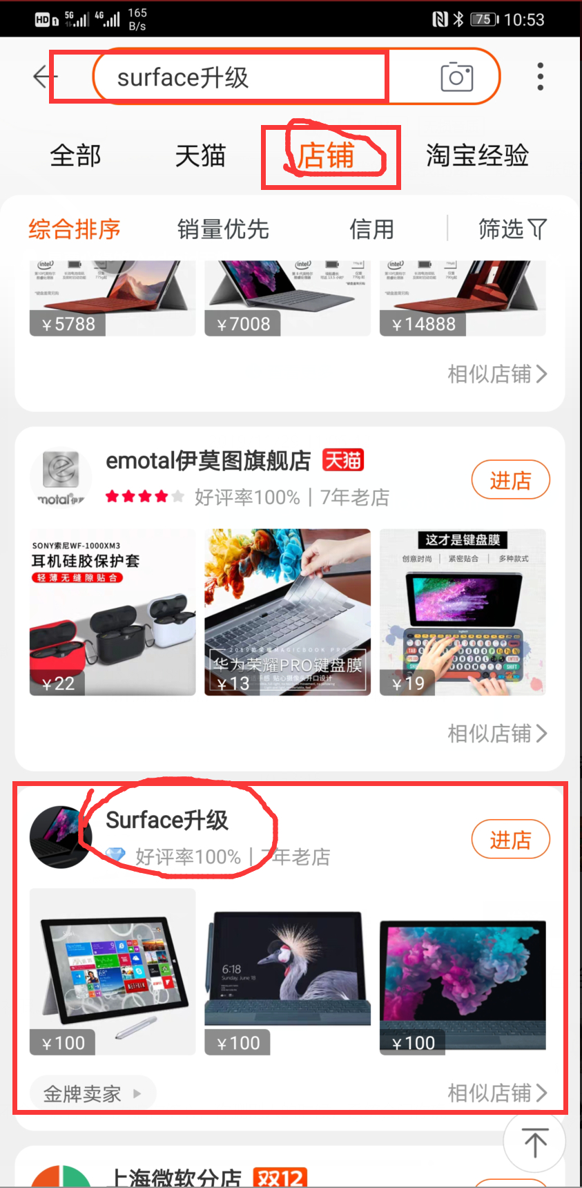 手机淘宝搜索:surface升级,选择店铺就可以找到【图片】