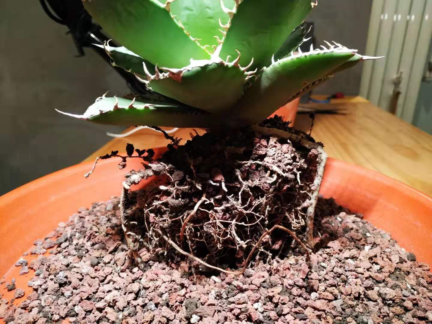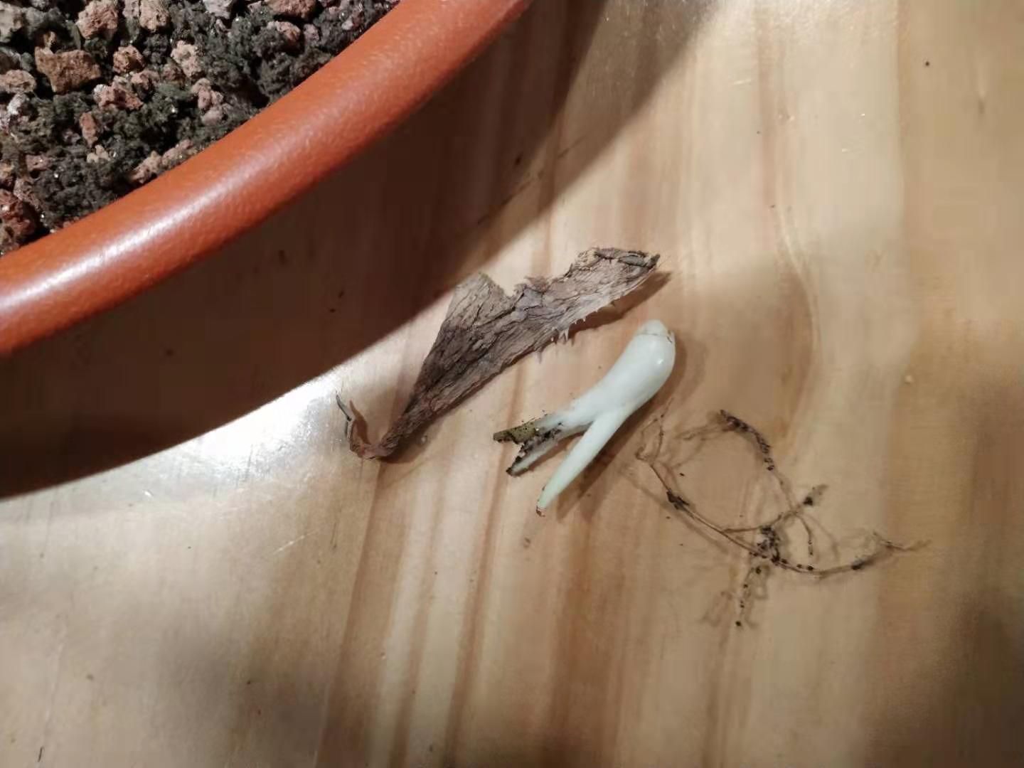 拿镊子拔烂了也没弄下来,没想明白直接翻盆了,断这一个月水(中间轻微浸盆一次),根基本都呈半干状态,不知道再断下去是干死还是休眠呢?之前才3成颗粒,铺面特别厚,我手笨都是拿铺面撑住植物种,这次把原铺面搅拌到土里,瞬间变7成颗粒了,既然翻盆干脆种高点给根腾些空间,可是种完才发现家里没铺面了植物只能勉强立住,还得尽快买火山岩颗粒。如果这次把定根水一浇,断水休眠的尝试算是破产了,纠结。。。。