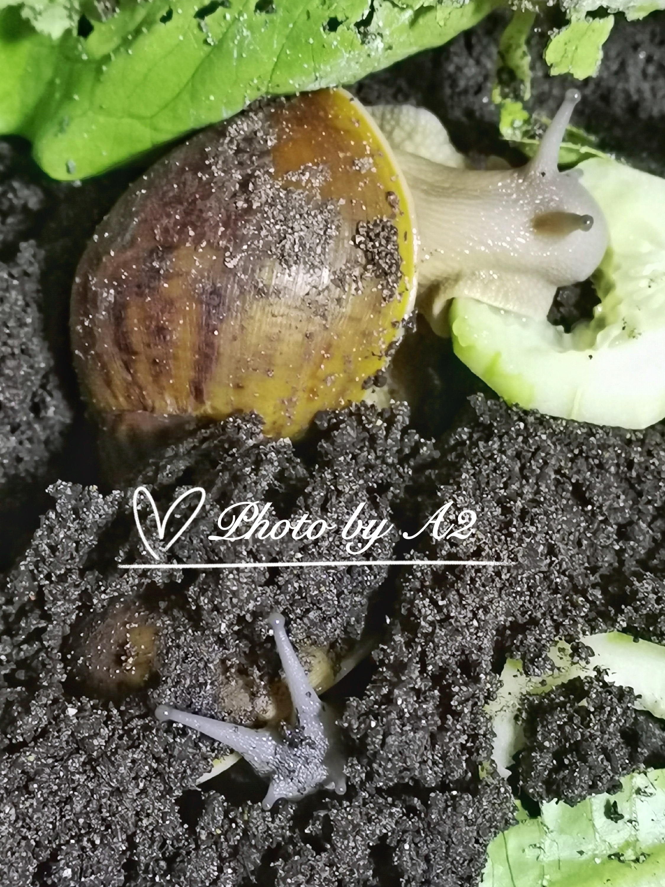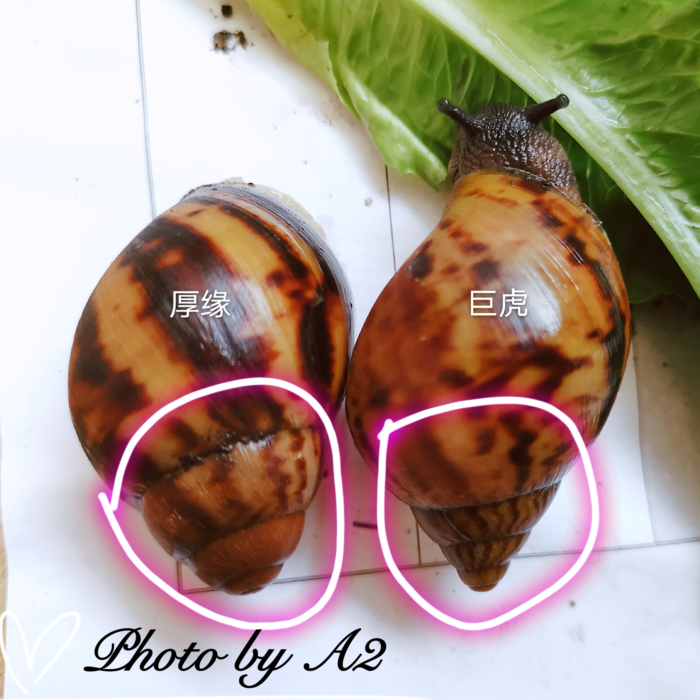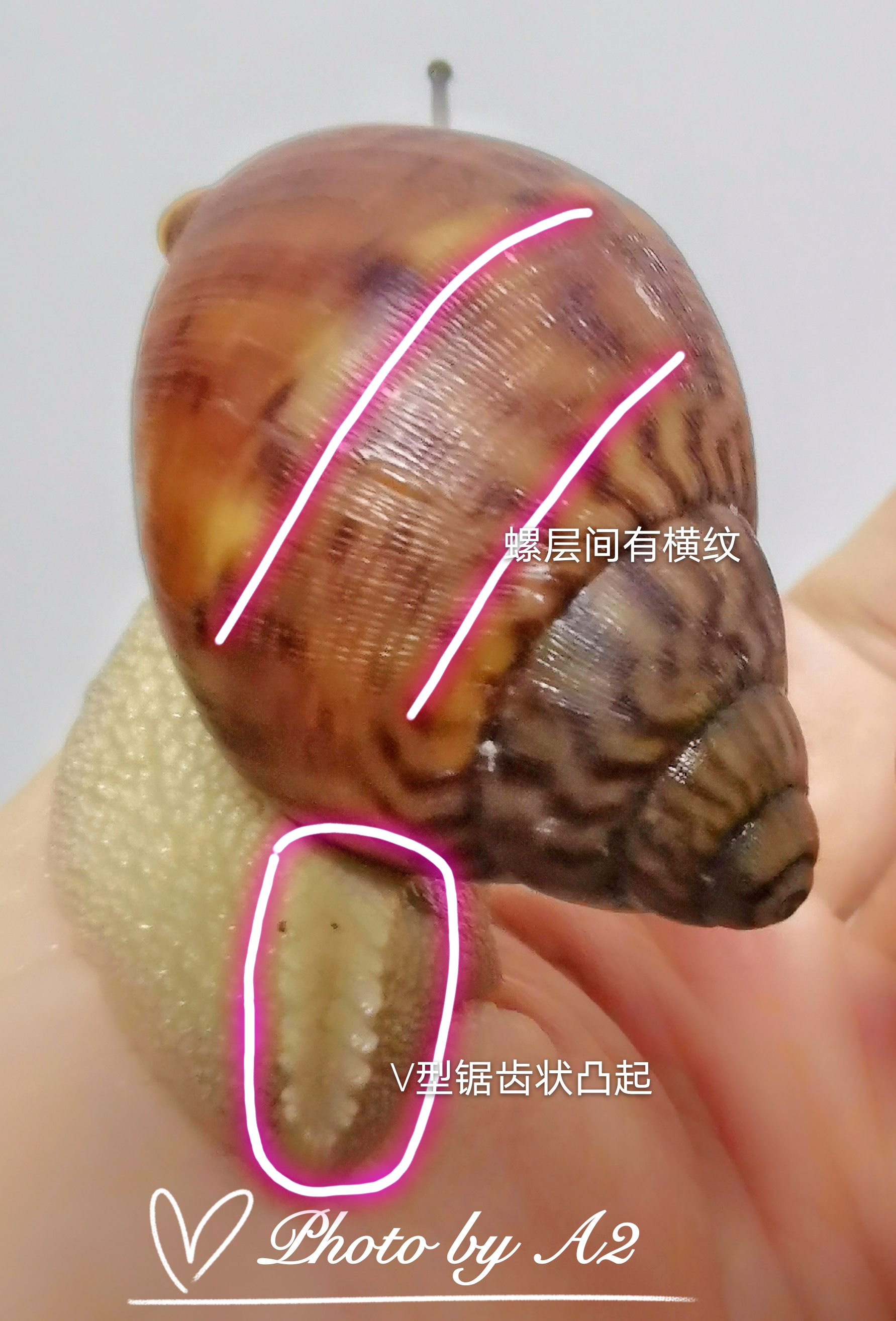 2、加纳巨虎蜗牛腹足尾处有“V”型锯齿状凸起结构(详见下图),一般出生没多久就有,我最小的0.8厘米长的幼蜗牛就已经有非常明显的V结构了,这种结构仅巨虎蜗牛和Archachatina属的蜗牛才有(原玛瑙螺属:厚缘、凸腹、普氏之类的蜗牛);