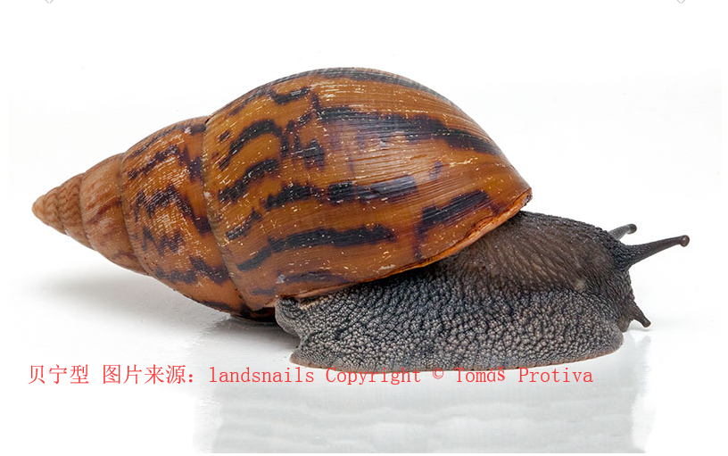 Achatina Achatina壳的基色为黄色、浅黄色或橙色,并具有深色条纹。根据外壳上的典型条纹,该蜗牛也被称为“老虎蜗牛”,成年蜗牛有7-8个螺层。鉴别这种蜗牛一般看两个特征: