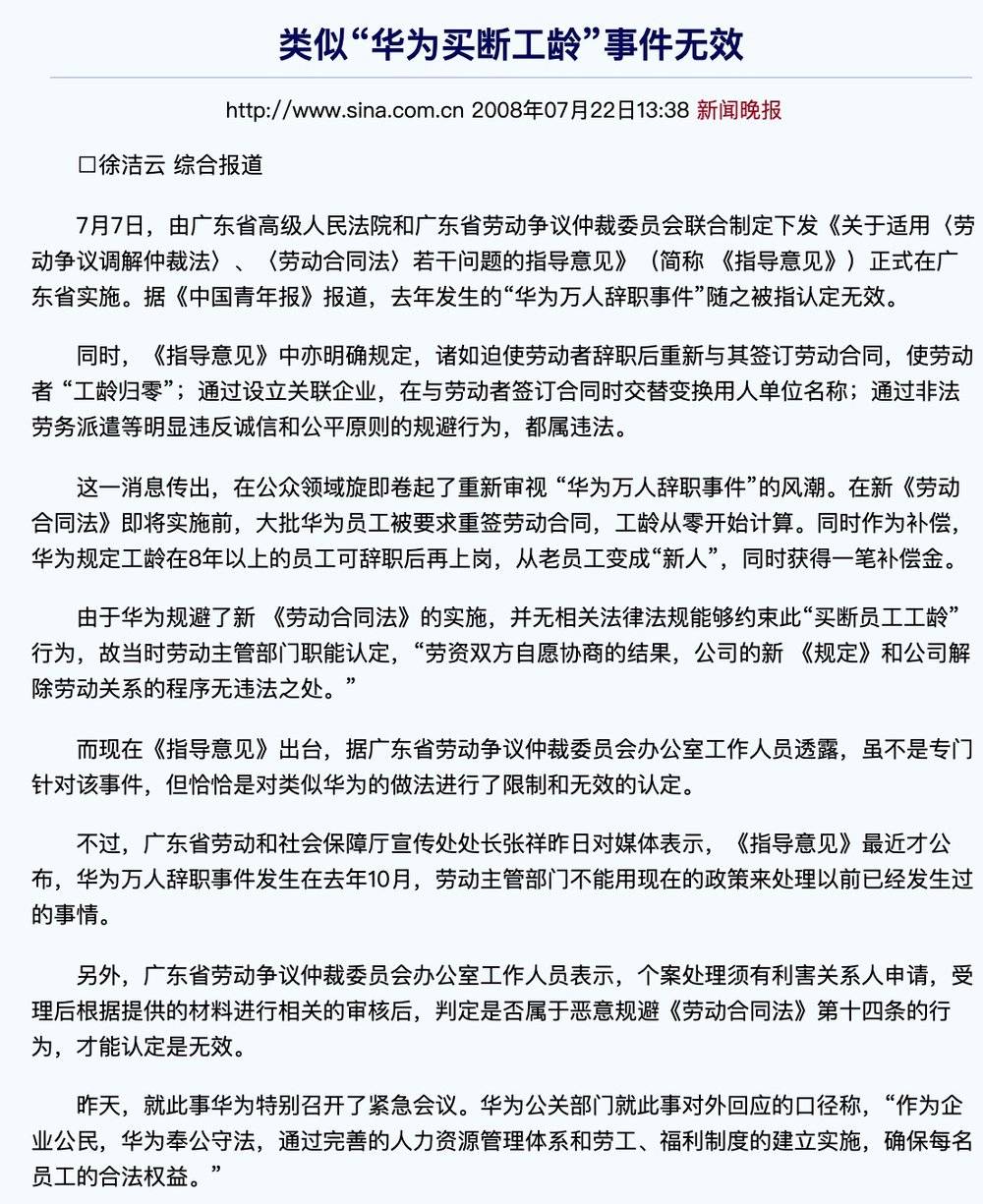 当初华为为规避该条,曾于07年导演了华为万人请辞事件,引导几千员工主动离职并重签合同刷新工号,同时给了N+1的补偿(不给没人会这么做)。
