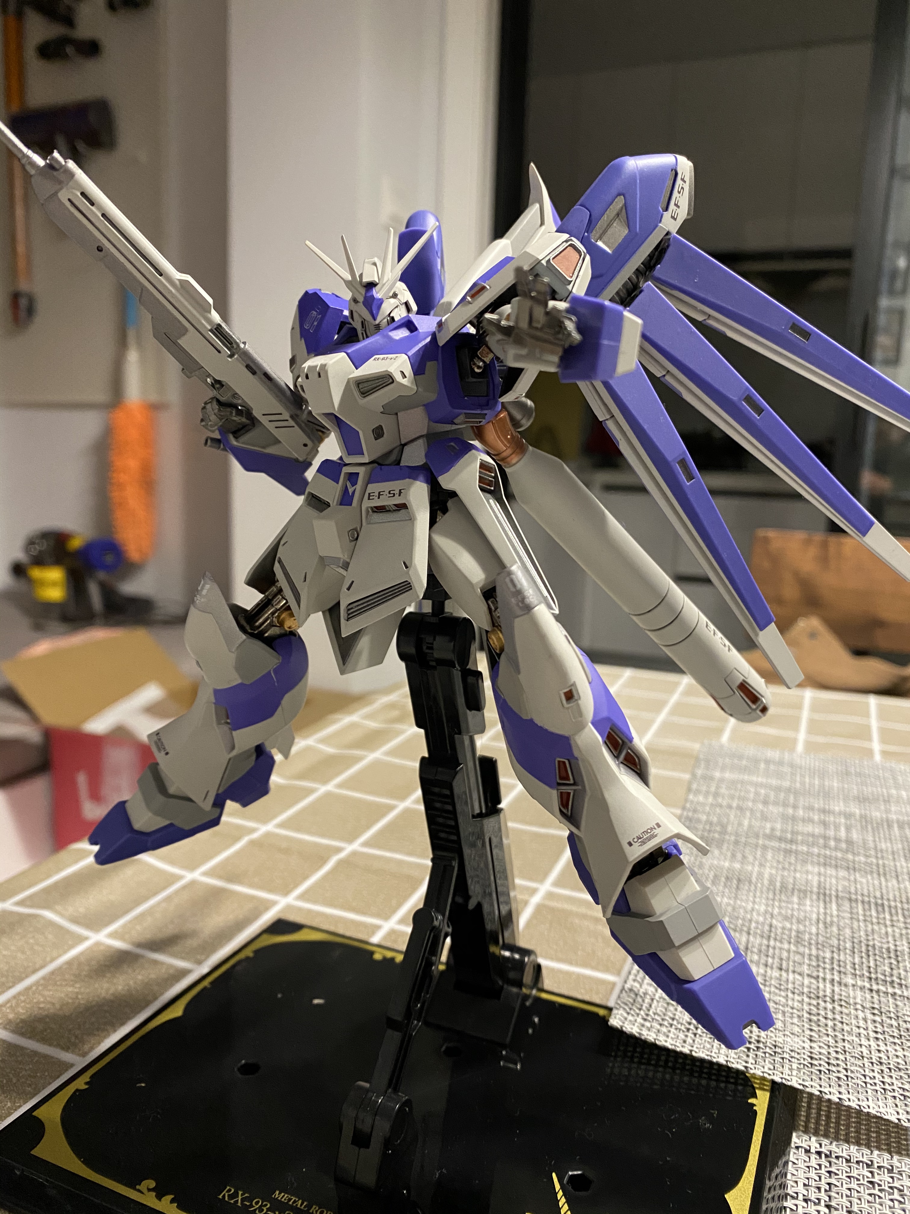 说下感受吧,脚掌不可动以及那分模线简直不是人设计出来的,涂装没什么很过分的中奖(有一侧小臂有一个小污点),小腿两侧瑕疵比较严重.....关节还算紧实,但是浮游炮左右摆略松这个不是很爽