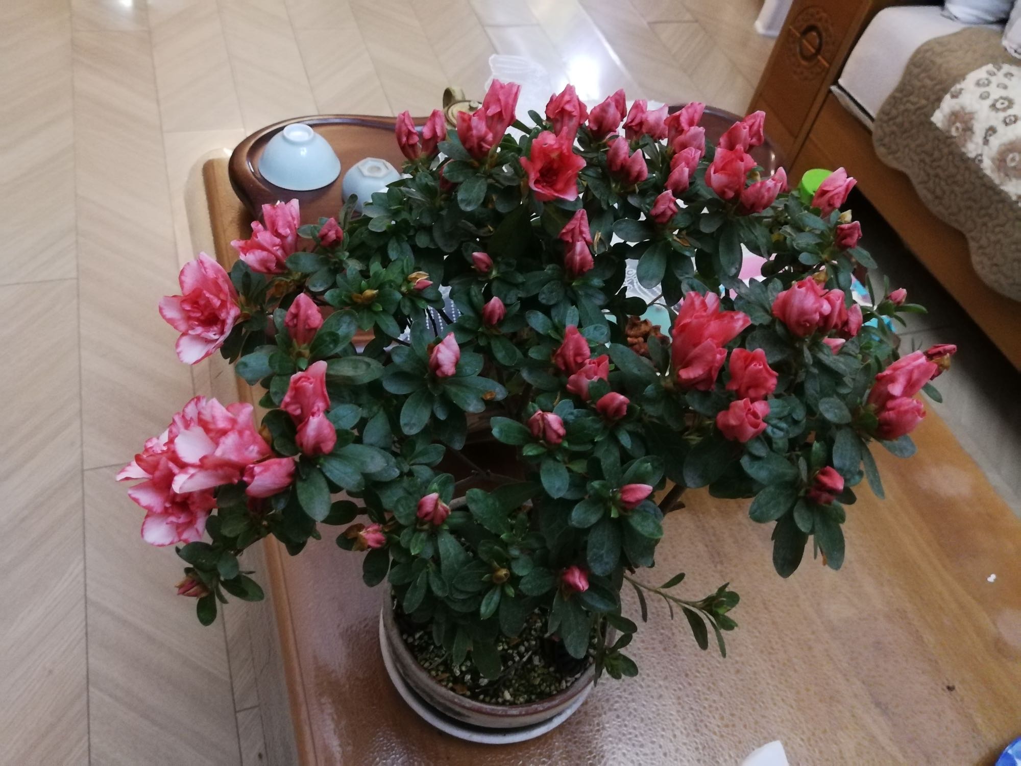 没生什么病,旁边养的梅花夏天招了红蜘蛛,居然也没传染她。浇水基本一到两天浇一次,夏天有时候需要早晚各一次。夏天出去旅行专门买了自动浇花的东西,再加上请朋友隔一天过去帮我看看。着实也废了心思。