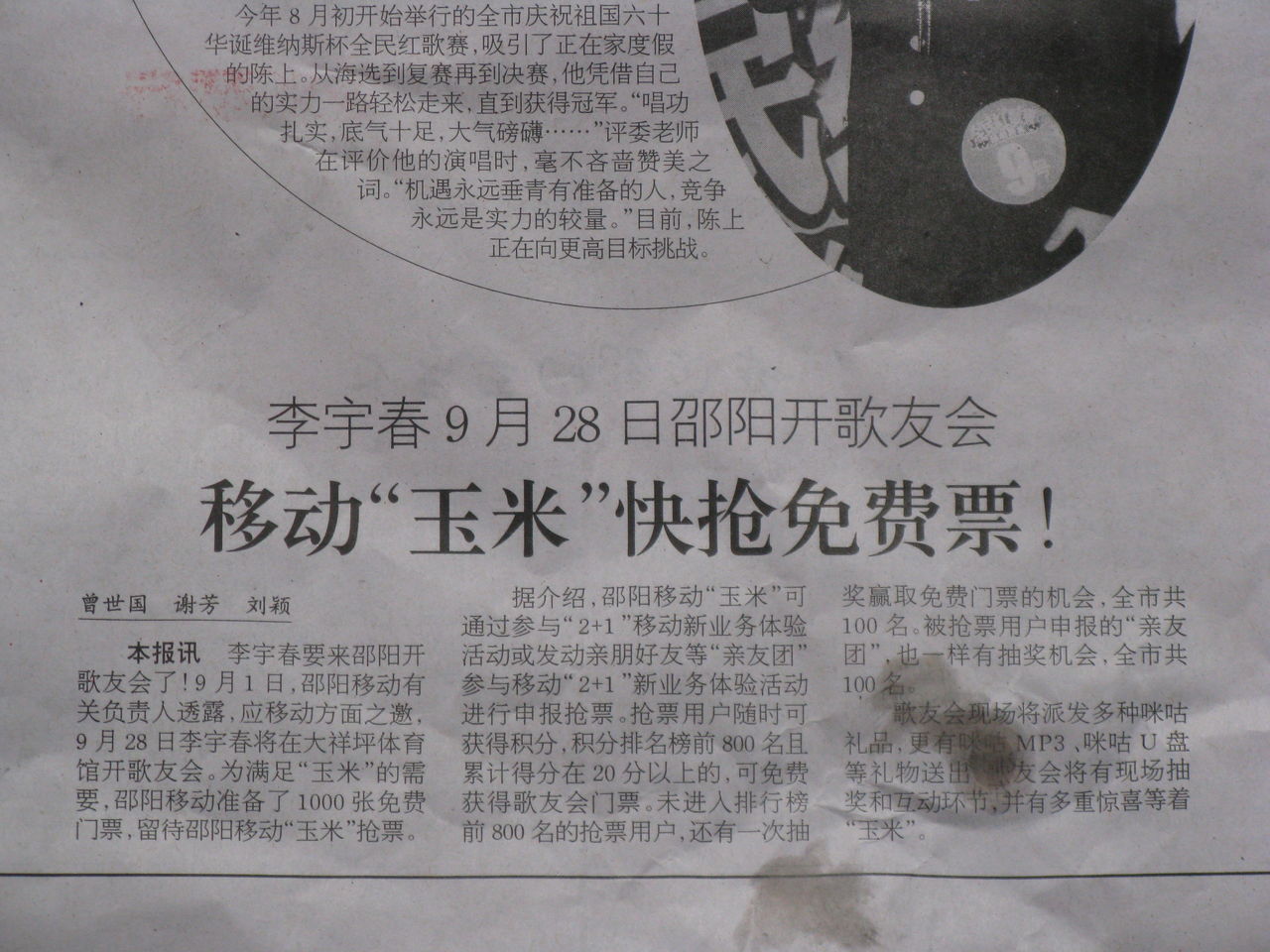 早上还在床上,单位同事电话给我,兴奋的说:“告诉你一特大好消息,李宇春要来我们这体育馆开歌友会了“。我:“真的??哪里的消息?”同事:“我们这的晚报登的,是9月28号。”