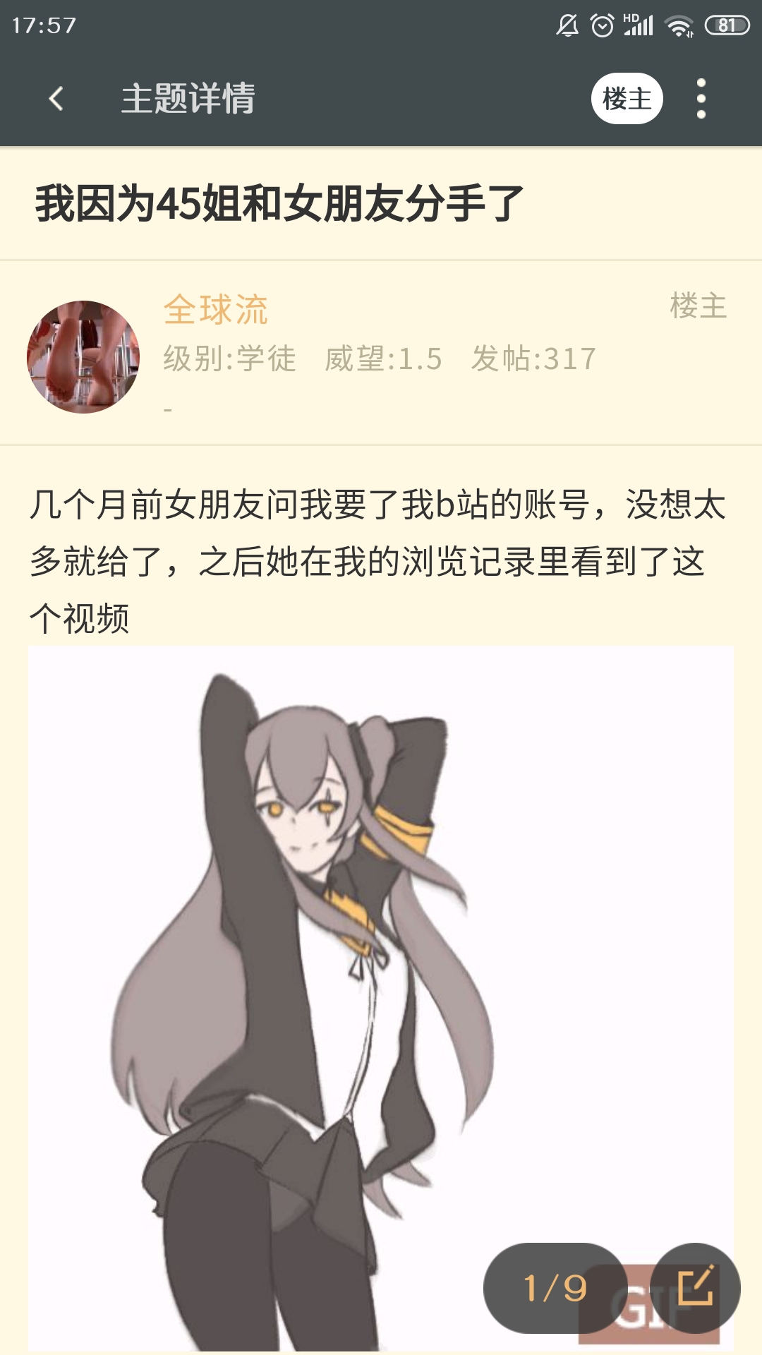 楼主大意是女朋友看见45姐这张动图,认为45姐太瑟琴了,让那个楼主把游戏卸了,经过思考后那个楼主选择把女朋友甩了舔纸片人