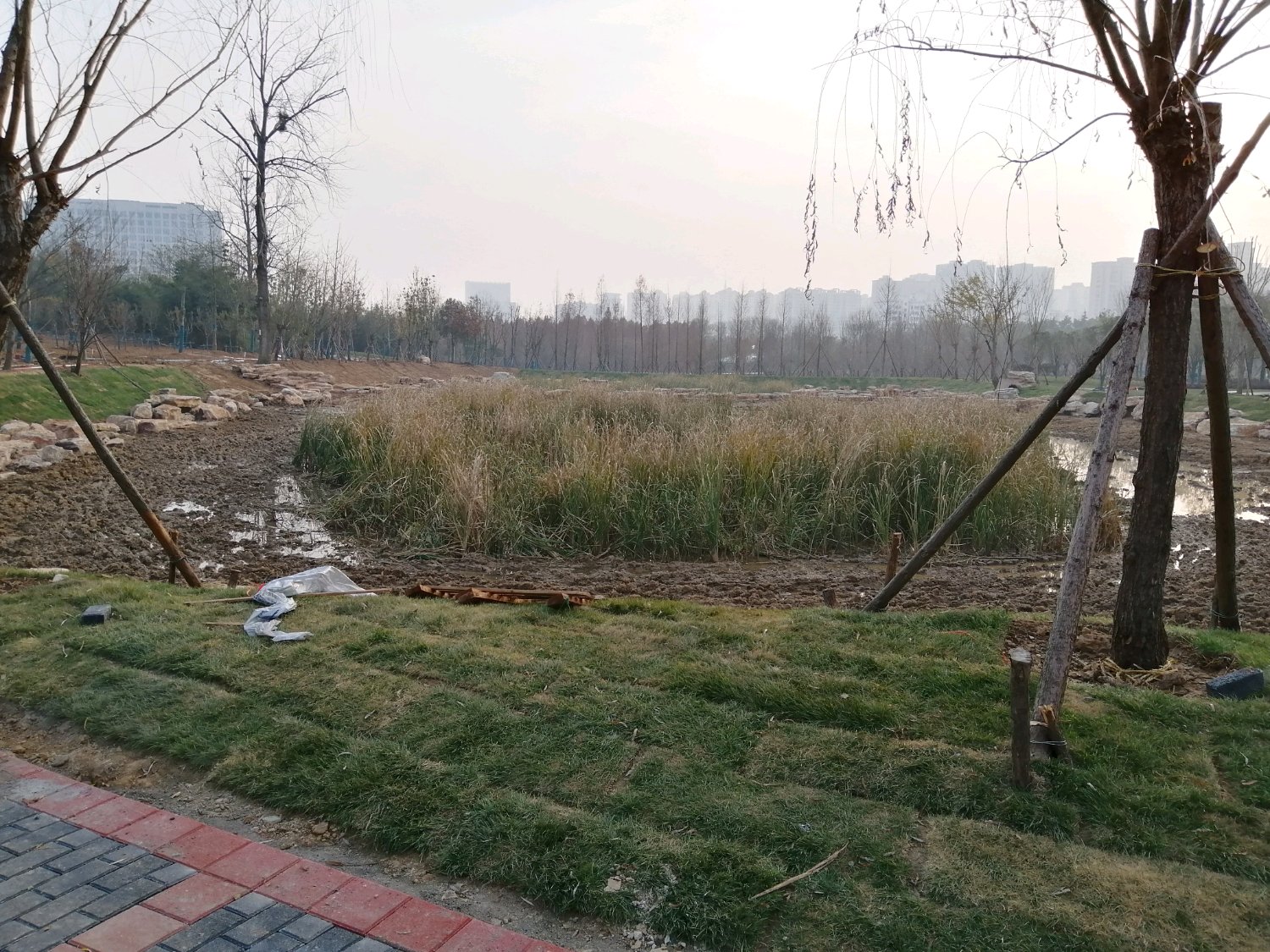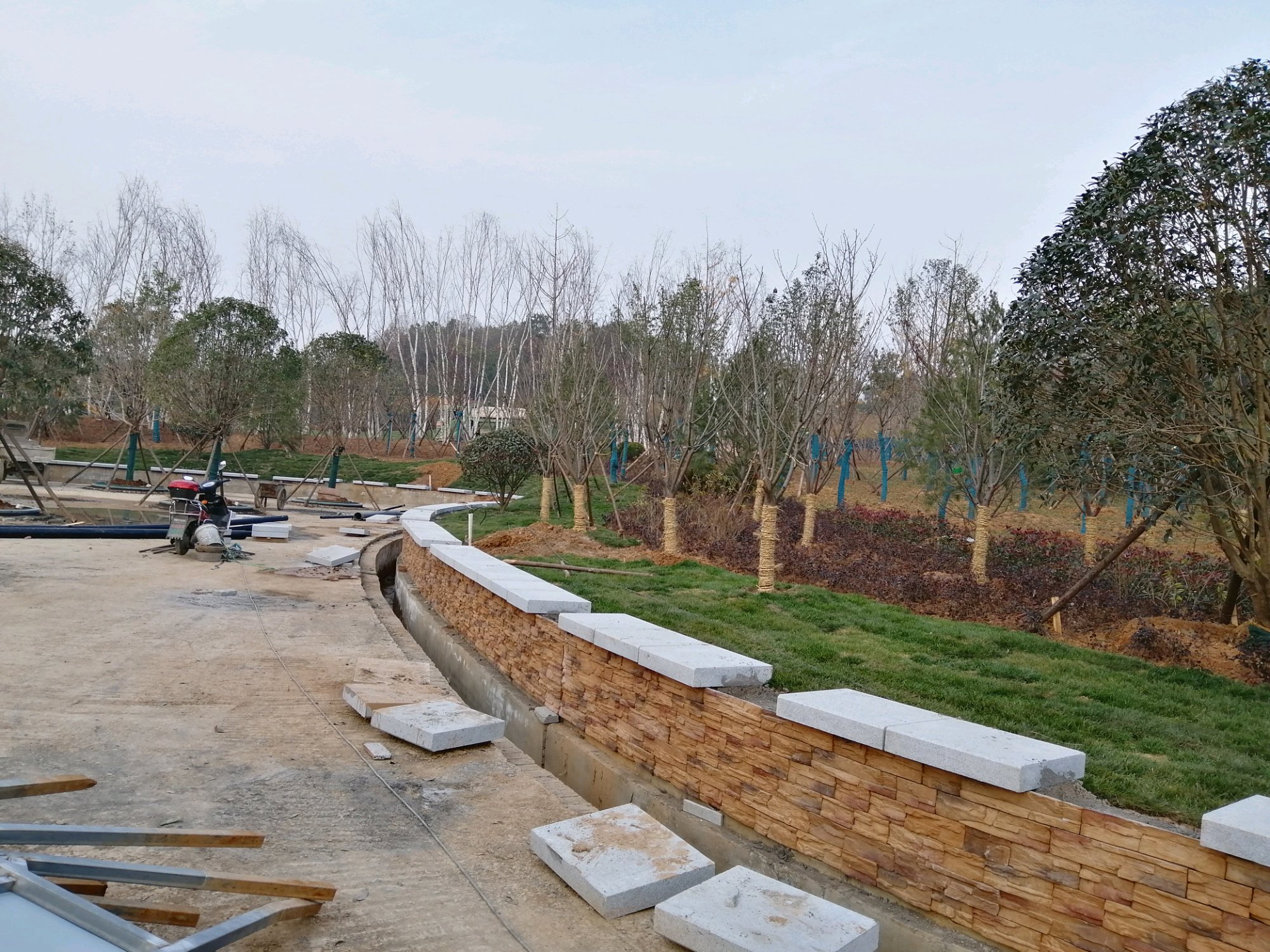 目前最西边区域主路路基混凝土都已经浇筑好,东边一半还都是土路,土方车还在来回运土。主路都是沥青路,小路是砖铺贴