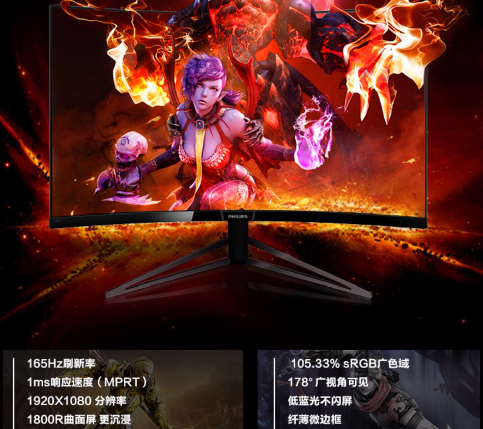 飞利浦 27英寸 165Hz 1800R曲面Freesync 猛腾 278M6QJEB5