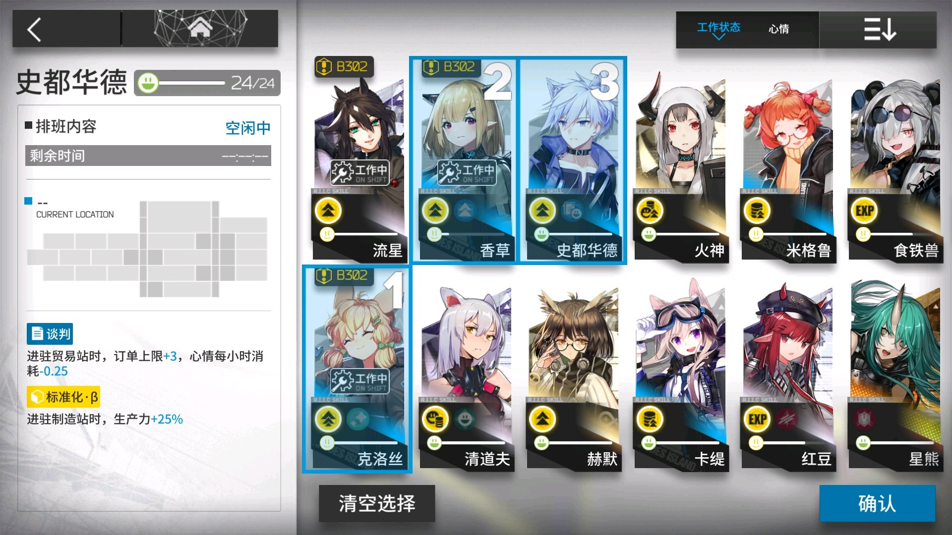 加速都是加速经验。 我是分2波换班的,早上起床让控制中心和贸易战的人休息,中午吃饭的时候让休息完的人上班,然后晚上回家让制造站的人休息,睡前再让制造站的人重新上班 (宿舍全5000,所以很快就回满)做满24小时换的话太乱了,我这样换非常规律,就不用一直算时间