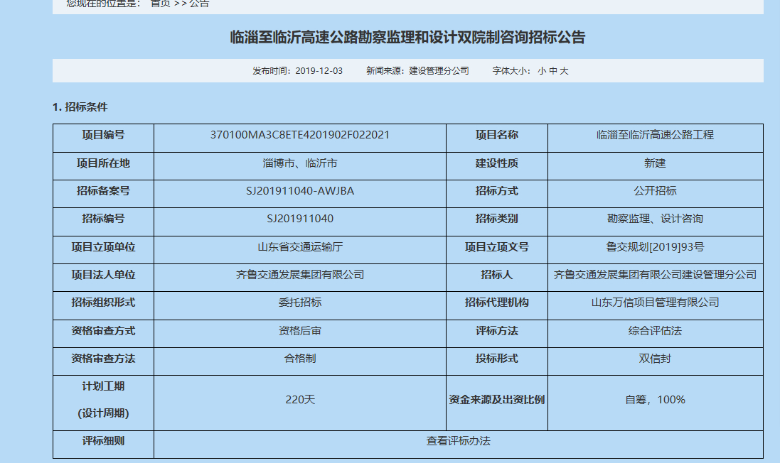 临淄至临沂高速公路工程勘察设计招标公告