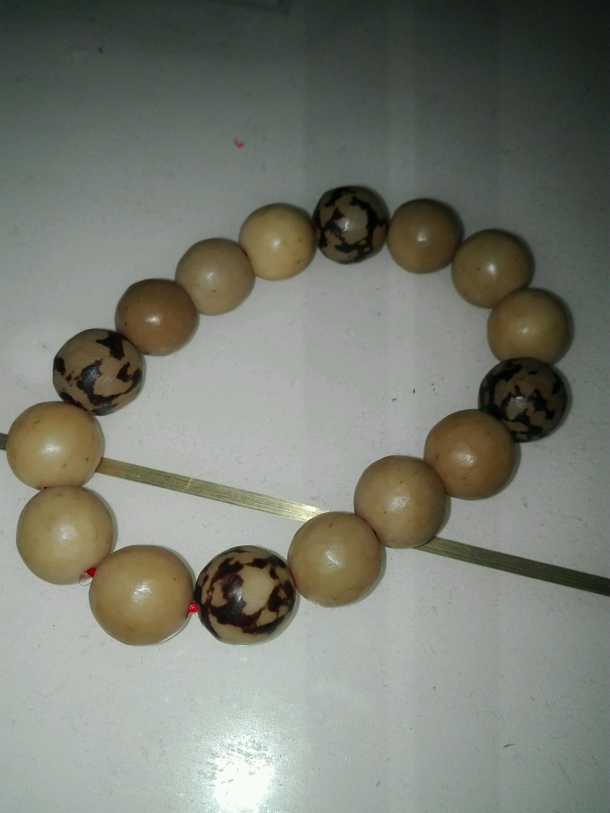 这是菩提果,刚开始就是圆的,表面有一层黑色的皮。磨掉就是白色的,在打孔穿起来