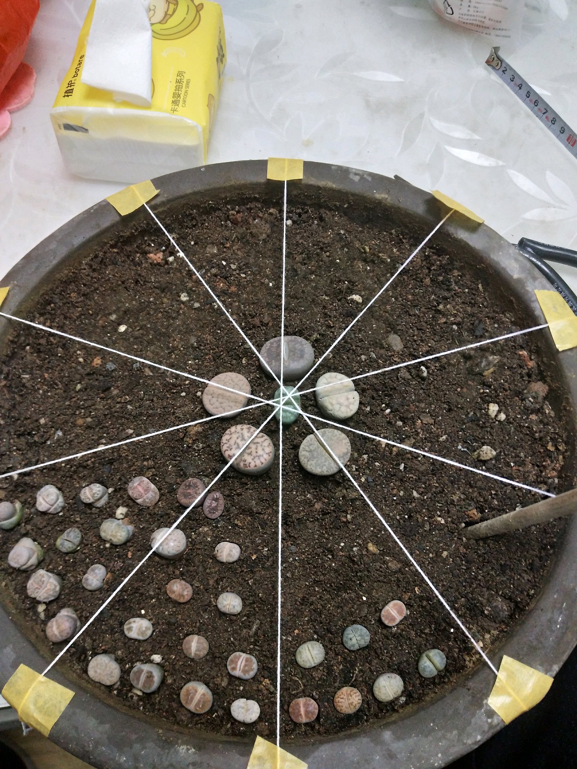 新手入坑。图便宜,在朋友圈买的19.9包邮100多颗,除中间的大的。为了好看我也是够拼的,先量长度再拉线。坐板凳上 插了一个多小时。快快长大吧!
