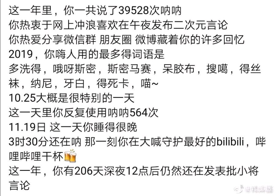 亲爱的吧友,欢迎查看你的年终报告。这一年里你在微博看了114514张色图 你热衷炼铜 百合 足控 你爱白丝足 你最关注的博主是带带大师兄 2019你看完色图用的最多的词语是GKD 5.20大概是很特别的一天 这一天你对着新堂變身本冲了8次 12.24这天你睡得很晚 4时58分还在看色图 那一刻你在发 色图摩多阿里嘎多 这一年 你有365天深夜12点后还在ghs。