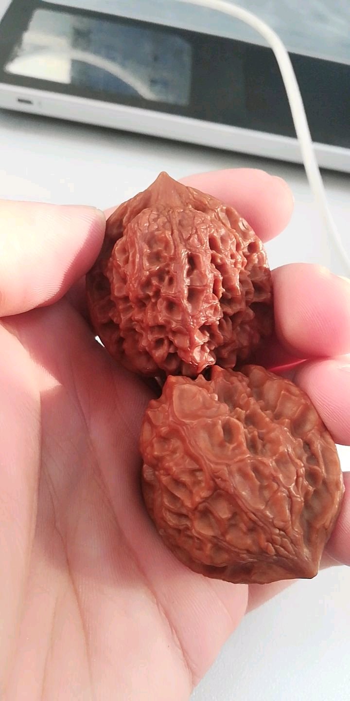对于包浆,我是这么理解的:首先核桃经过和手的摩擦会变得光滑,这就是我们所说的挂瓷,这是一个物理变化,然后手上的汗液油脂慢慢渗透核桃的内部逐渐氧化并固化,从而使核桃慢慢变红,这是一个化学变化。当核桃达到一个饱和的状态时,便会在核桃表面形成一层保护膜,