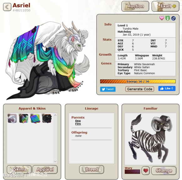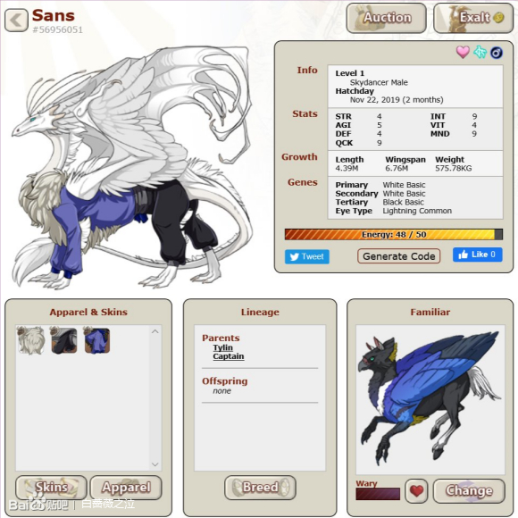 白色是个很有意思的颜色,一二基因里面只有basic和是最纯的白。所以这只sans。。。双白XXY全basic基因,三色是啥根本不重要了。眼睛颜色浅蓝,还原审判眼的颜色。然后在挑龙种的时候就只在 以左侧面对玩家的公龙里选,然后选了Skydancer(下简称天舞)—— 因为他很帅!公天舞在玩家中还是挺受欢迎的!