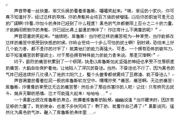 声音说完这句话之后就消失了...“感情...就是负累吗!?”一道漆黑的门出现在了库鲁斯地面前,“这就是那声音所说的那道力量之门么!那么,我..我就打开它把!”