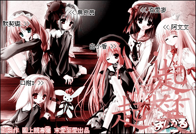 - 小煤炭、自恋陌、死大卓、成熟默、早熟莹、狮子妹、死昔派、阿晴晴、爪子妈 。