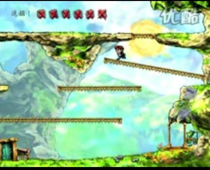 兔子跳到第二层最右边小怪的身上,杀死小怪,同时被顶起到斜坡