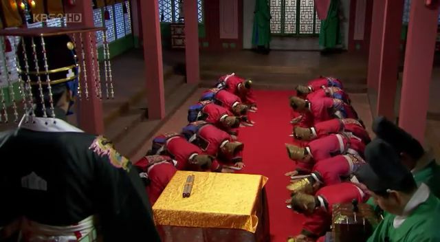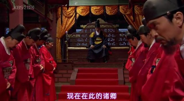第一张:众大臣身着礼服,俯地向新王行礼。。不得不说,朝鲜真是小国,这大臣也忒少了点吧,这大殿也忒小了点吧。。假如,换作张纪中来拍,啥也不说了,文武百官先整得黑压压一片,大殿搞得金壁辉煌滴。呵呵。。走神了。。公子别骂我。。