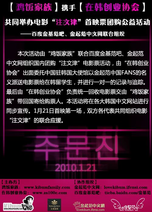 【鸡饭家族】携手【在韩创业协会】共同举办电影“注文津”首映票团购公益活动——百度金基范吧、金起范中文网联合组织
