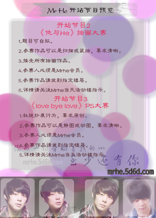 2.图片必须3张来源于Mrhe站中。 3.参赛人必须是Mrhe会员。 4.参赛作品请发到指定楼层。 5.详情请关注Mrhe当天活动楼指示。