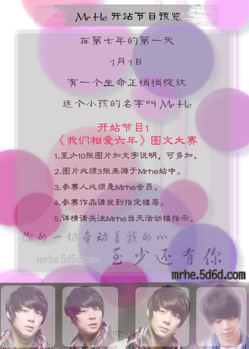 以上均为1月1日节目预览。 如节目有所更改,我们会及时通知。               活动                        时间 节目1《我们相爱六年》图文大赛        1月1日-2日全天 节目2《他与He》绘画大赛             1月1日-2日全天 节目3《Love bye love》PS大赛          1月1日-2日全天 节目4 竞猜大赛                       1月1日晚上6:00 节目5《原地等待》作文大赛            1月1日-2日全天 节目6 抢签活动             大吧_1月1日晚上7:00     Mrhe_晚上7:30