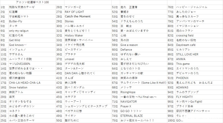 【动漫主题曲总选举】1~100位公开