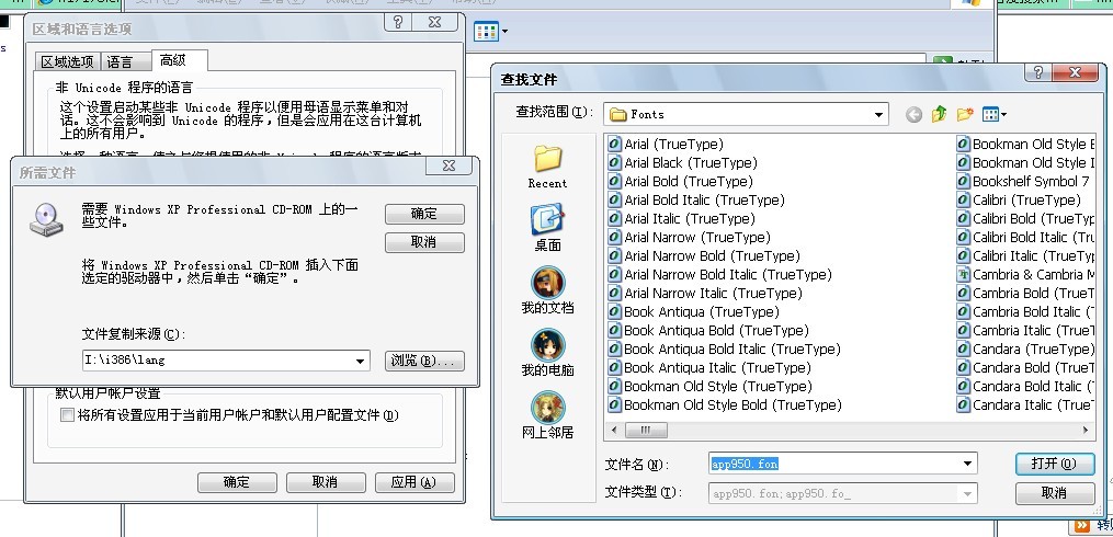 好,回正题,在高级里点击确定,弹出的插入磁盘对话框也点击确定,然后所需文件里选浏览,指向C\WINDOWS\FONTS文件夹,如果你的系统里已有字体文件那么它会自行抓取出APP950文件。