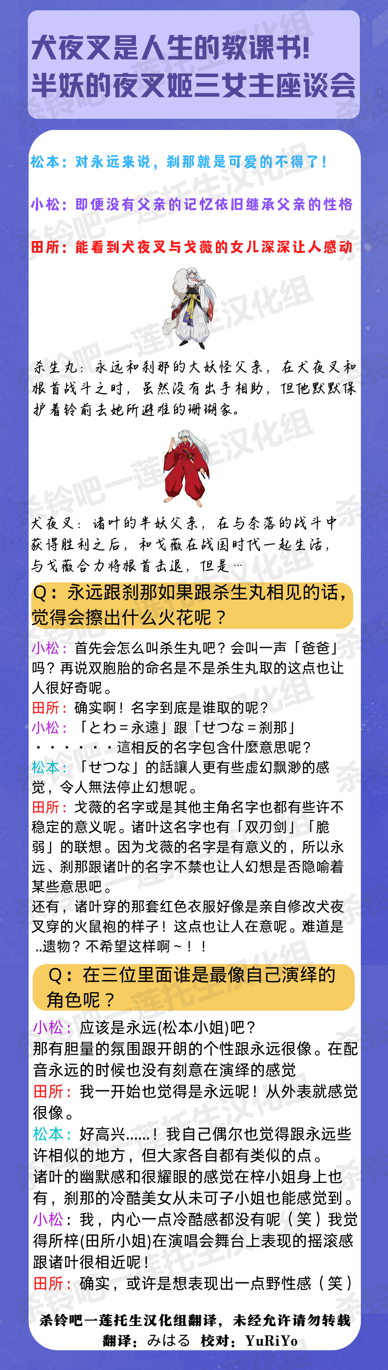 犬夜叉是饰演三位女主角的松本沙罗丶小松未可子和田所梓她们的回忆,聊到欣赏的角色和喜欢的剧情桥段,并透漏当初收到声优甄选会消息的兴奋之情。配音的同时也透过剧情中三人的互动一边认识角色。