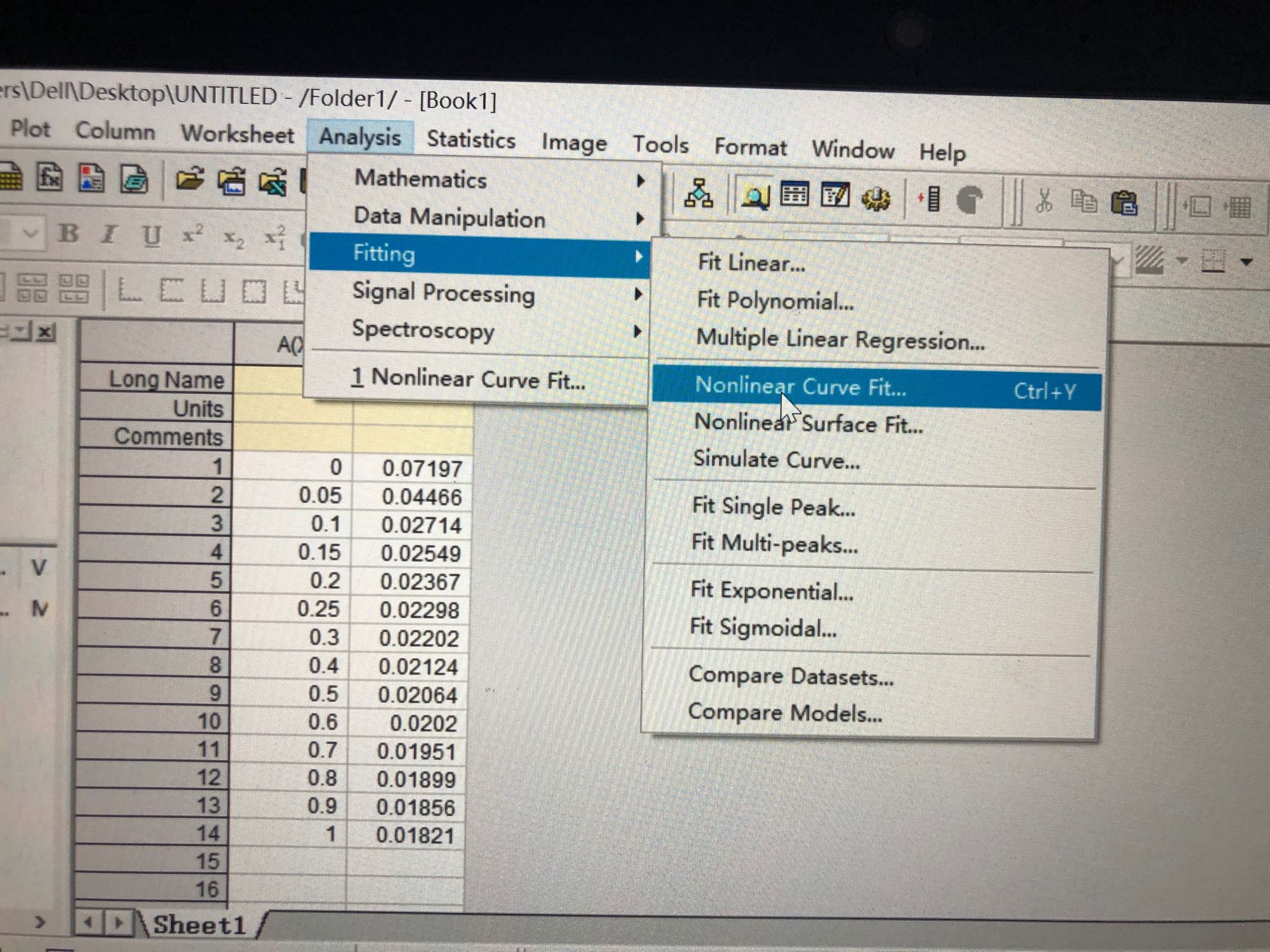 大佬们,为什么无法非线性拟合啊,没有对话框弹出急求