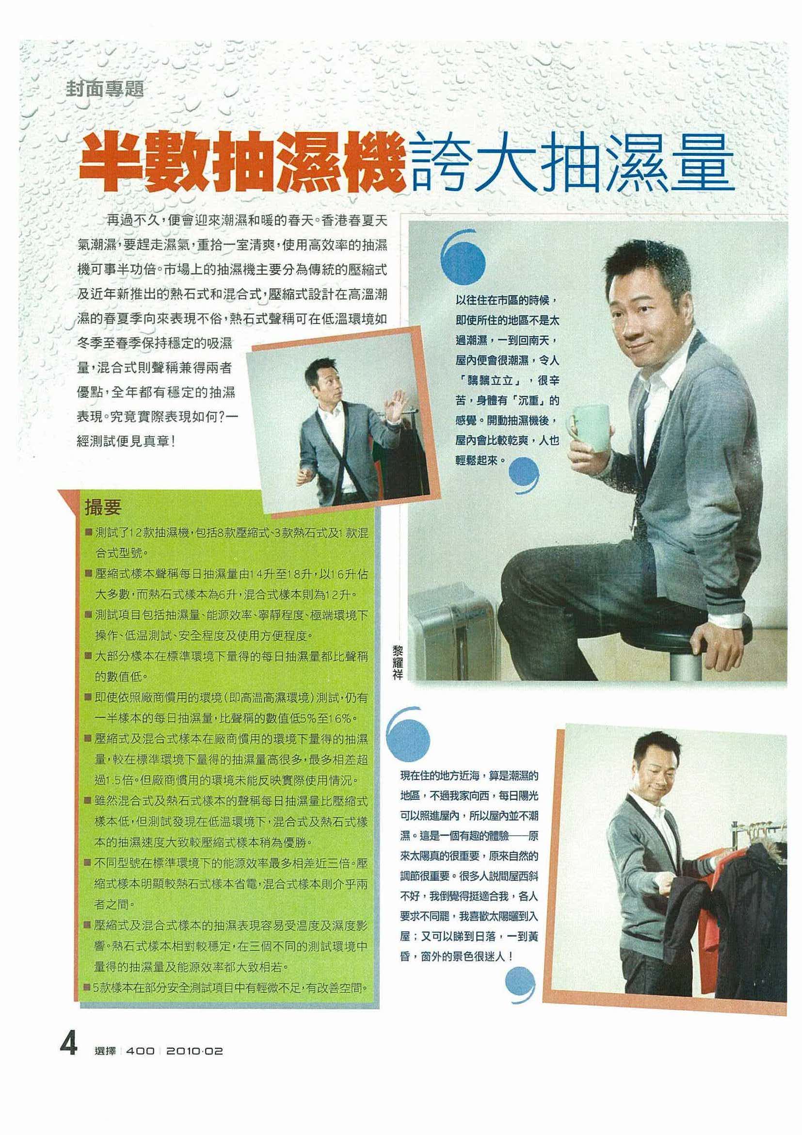 穿白裇衫深色背心坐在黄色沙发,旁边一架抽湿机(本期主题),后面一盆桔和福字挥春,红色背景,另有红色大字:半数抽湿机 夸大抽湿量