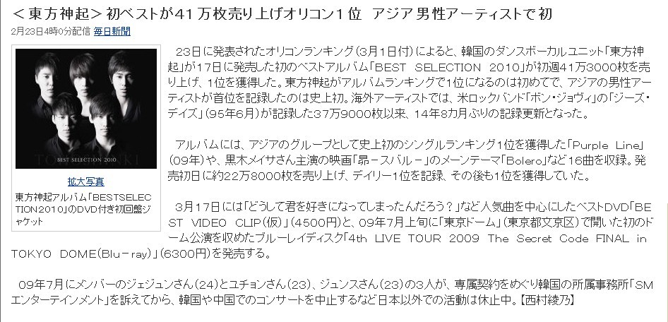 23日に発表されたオリコンランキング(3月1日付)によると、韩国のダンスボーカルユニット「东方神起」が17日に発売した初のベストアルバム「BEST SELECTION 2010」が初周41万3000枚を売り上げ、1位を获得した。东方神起がアルバムランキングで1位になるのは初めてで、アジアの男性アーティストが首位を记录したのは史上初。海外アーティストでは、米ロックバンド「ボン・ジョヴィ」の「ジーズ・デイズ」(95年6月)が记录した37万9000枚以来、14年8カ月ぶりの记录更新となった。