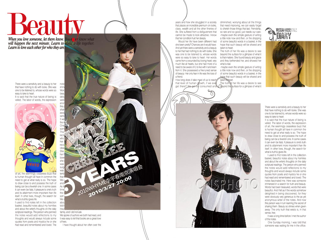此次曝光的海报大片,李宇春身着热度永不退却的黑白色经典搭配,以新形象赤脚出镜,肢体动作摆出的造型仿佛数字“5”。 从全民票选的选秀冠军,到人气居高不下的偶像明星,出道5年的李宇春并没有像某些人所预言的那样“如流星划过”,反而越发璀璨夺目。作为华语歌坛唯一拥有自己品牌演唱会的歌手,每年由天娱传媒举办的“Why Me”演唱会,李宇春都亲力亲为,并获得行业大师及各方巨头的强势加盟。2010年是李宇春出道的第5年,对她来说也是别具意义。
