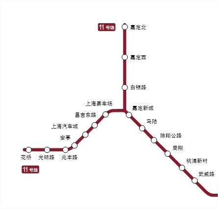 上海地铁11号线的北段是分叉线路。有嘉定北和花桥两个终点。地铁列车是一夹一运行。在终点为花桥的线路上,安亭是上海境内的最后一站(属于嘉定区),而兆丰路、光明路、花桥这三站在江苏省昆山市境内。已经在施工的苏州地铁S2线,将在花桥与上海地铁连通。