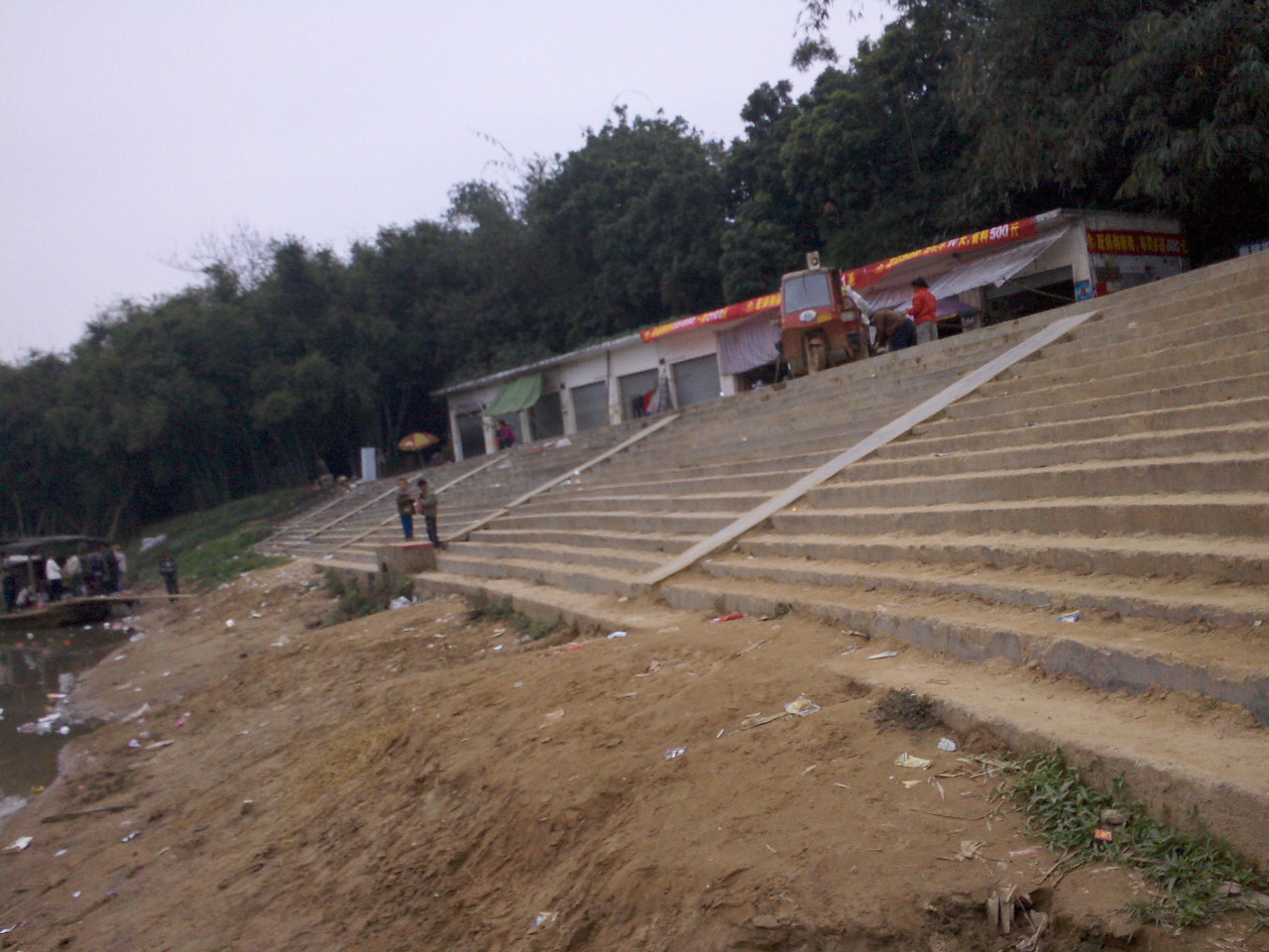 码头上的台阶。有一些沙洒在上面了,也不清理。要小心啊,不然会跌倒的。