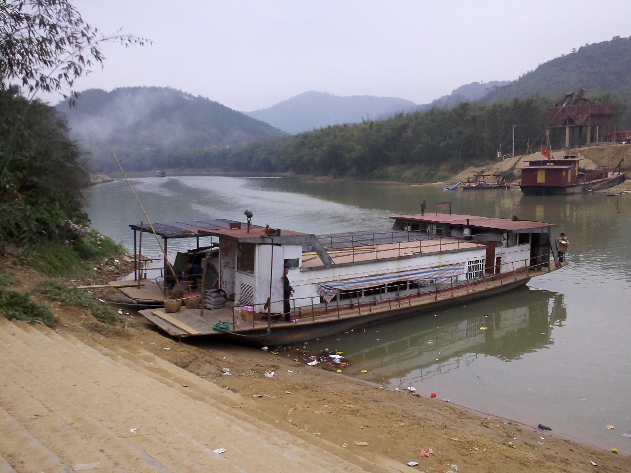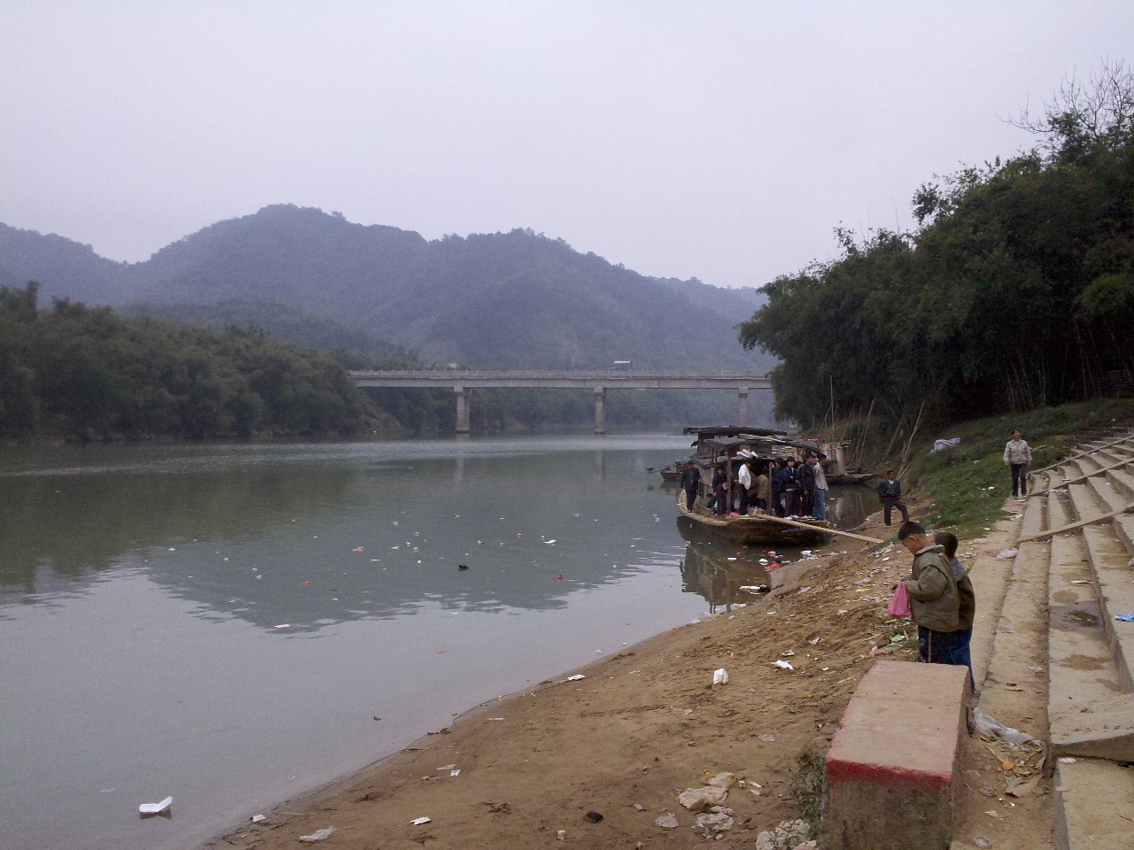 远处是新建的波塘大桥(不是原来旧的那条),有一艘船,有几个乘客在甲板上。