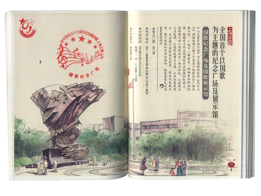 首先,我去了全国首个以国歌为主题的纪念广场及展示馆-国歌纪念广场及国歌展示馆。国歌纪念广场的确可以去遛一圈,广场中心雕塑值得一看,感觉很抽象……不过国歌展示馆(荆州路151号地下展馆)就不用特为赶去参观了,去年在我拿到《庆祝中华人民共和国成立六十周年游览护照纪念版》的时侯去了一次,闭馆,不过在入口处还有接待人员,敲了纪念章……今年我又去了一次,是2010年3月11日星期四,这下是彻底没人了,馆前立了块牌子,上注“内部调整、暂时闭馆”……