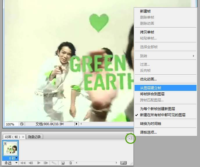 点击绿色圈圈中的箭头.选择从图层建立帧