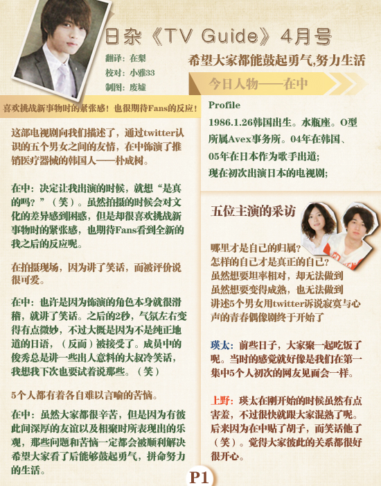 【幸福遥望】【100412+翻译】日杂:在中说希望大家都能努力生活